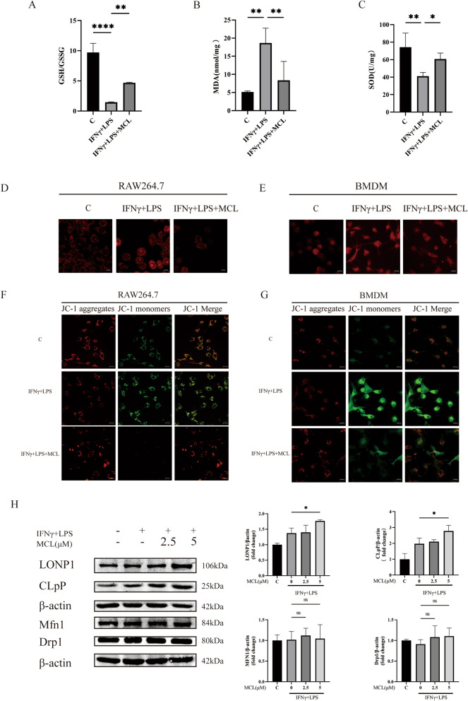 Methods: In vitro, lipopolysaccharides (LPS) and interferon-gamma (IFN-γ) were used to stimulate RAW264.7 cells and bone marrow-derived macrophages (BMDMs) to investigate the protective effect of MCL on sepsis-induced ALI. Cecal ligation and puncture (CLP) models were constructed in mice to induce ALI in vivo. The expression of inflammatory factors, macrophage polarization markers, and the glycolysis-related enzyme 6-phosphofructo-2-kinase/fructose-2,6-biphosphatase 3 (PFKFB3) were measured in vivo. Mitochondrial function, oxidative stress, and mitochondrial-related proteins were evaluated in vitro.