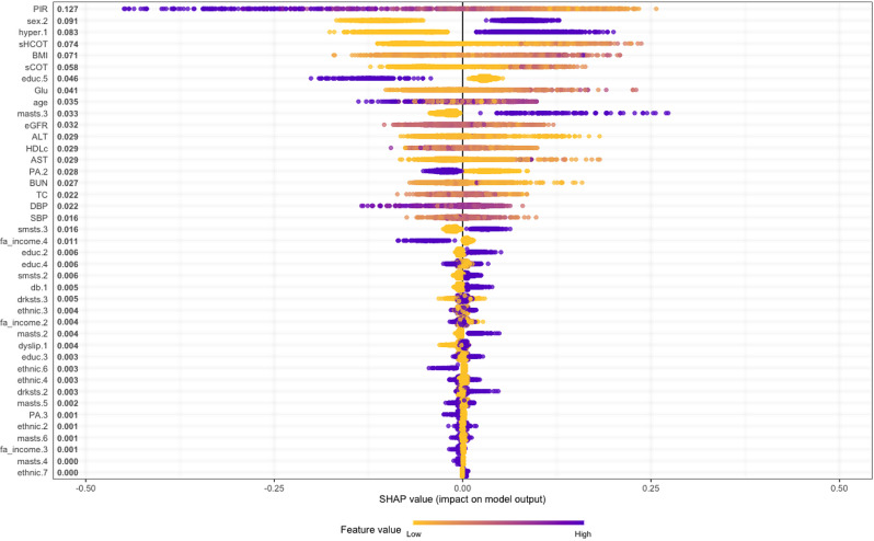 Conclusion: We developed ML models to predict depression and utilized SHAP for interpretation. This approach identifies key factors associated with depression, encompassing socioeconomic, demographic, and health-related aspects.