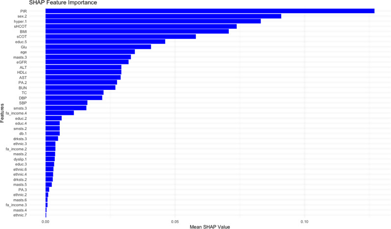 Results: XGBoost was identified as the best-performing model, achieving the highest accuracy, sensitivity, specificity, precision, AUC, and F1 score. SHAP analysis highlighted the most significant predictors of depression: the ratio family income to poverty (PIR), sex, hypertension, serum cotinine and hydroxycotine, BMI, education level, glucose levels, age, marital status, and renal function (eGFR).