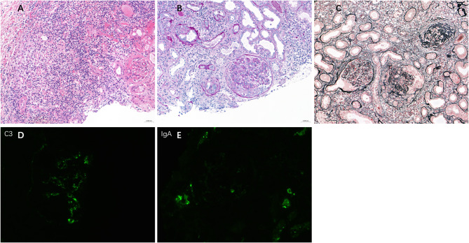 Case presentation: In this study, we report the consequences of Mycoplasma pneumoniae (MP) infection in a 66-year-old male Chinese patient, who developed persistent hypocomplementemia, gross hematuria, and rapidly progressive glomerulonephritis. The findings of the histologic examination of an initial renal biopsy were consistent with a diagnosis of IgA-dominant postinfectious glomerulonephritis. The sample was negative for Gd-IgA1 staining. After treatment with antibiotics, glucocorticoids, and mycophenolate mofetil, the patient's serum creatinine decreased from a peak of 387 µmol/L to 195 µmol/L prior to discharge, and there was a partial response in his urinary protein concentration. After 2 months, his serum C3 concentration had returned to normal. However, owing to reinfection with MP the patient's serum creatinine rapidly increased again to 475.07 µmol/L, and this was accompanied by a decrease in serum C3 concentration (> 8 months) and positivity for C3 nephritis factor. Examination of both renal biopsies showed stronger immunostaining for C3 than for IgA in the glomeruli.