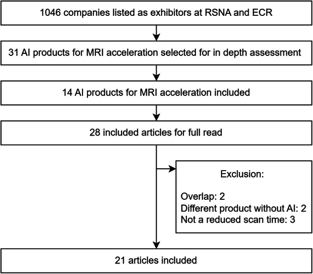 Results: Out of 1046 companies, 14 products of 14 companies were included. No scientific articles were found for four products (29%). For the remaining ten products (71%), 21 articles were retrieved. Four acceleration methods were identified: noise reduction, raw data reconstruction, personalized scanning protocols, and synthetic image generation. Only a limited number of articles prospectively demonstrated impact on patient outcomes (n = 4, 19%), and no articles discussed an evaluation in a prospective cohort of > 100 patients or performed an economic analysis. None of the articles performed an analysis of hallucinatory artifacts.