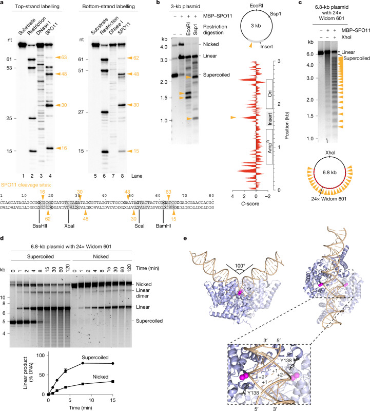 SPO11 initiates meiotic recombination through the induction of programmed DNA double-strand breaks (DSBs)1,2, but this catalytic activity has never been reconstituted in vitro3,4. Here, using Mus musculus SPO11, we report a biochemical system that recapitulates all the hallmarks of meiotic DSB formation. We show that SPO11 catalyses break formation in the absence of any partners and remains covalently attached to the 5' broken strands. We find that target site selection by SPO11 is influenced by the sequence, bendability and topology of the DNA substrate, and provide evidence that SPO11 can reseal single-strand DNA breaks. In addition, we show that SPO11 is monomeric in solution and that cleavage requires dimerization for the reconstitution of two hybrid active sites. SPO11 and its partner TOP6BL form a 1:1 complex that catalyses DNA cleavage with an activity similar to that of SPO11 alone. However, this complex binds DNA ends with higher affinity, suggesting a potential role after cleavage. We propose a model in which additional partners of SPO11 required for DSB formation in vivo assemble biomolecular condensates that recruit SPO11-TOP6BL, enabling dimerization and cleavage. Our work establishes SPO11 dimerization as the fundamental mechanism that controls the induction of meiotic DSBs.