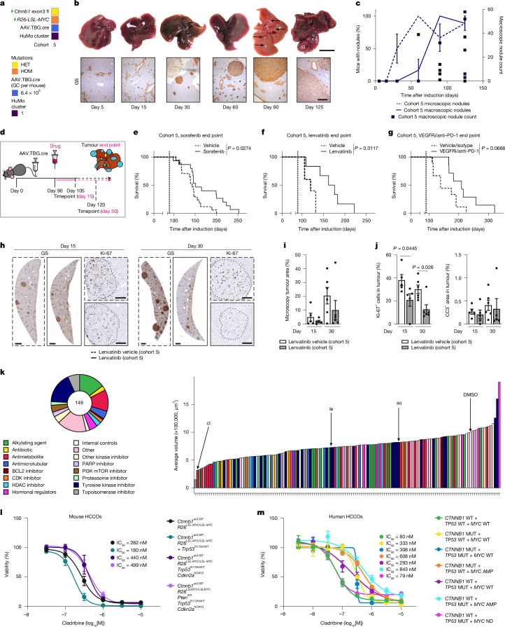 Hepatocellular carcinoma (HCC), the most common form of primary liver cancer, is a leading cause of cancer-related mortality worldwide1,2. HCC occurs typically from a background of chronic liver disease, caused by a spectrum of predisposing conditions. Tumour development is driven by the expansion of clones that accumulate progressive driver mutations3, with hepatocytes the most likely cell of origin2. However, the landscape of driver mutations in HCC is broadly independent of the underlying aetiologies4. Despite an increasing range of systemic treatment options for advanced HCC, outcomes remain heterogeneous and typically poor. Emerging data suggest that drug efficacies depend on disease aetiology and genetic alterations5,6. Exploring subtypes in preclinical models with human relevance will therefore be essential to advance precision medicine in HCC7. Here we generated a suite of genetically driven immunocompetent in vivo and matched in vitro HCC models. Our models represent multiple features of human HCC, including clonal origin, histopathological appearance and metastasis. We integrated transcriptomic data from the mouse models with human HCC data and identified four common human-mouse subtype clusters. The subtype clusters had distinct transcriptomic characteristics that aligned with the human histopathology. In a proof-of-principle analysis, we verified response to standard-of-care treatment and used a linked in vitro-in vivo pipeline to identify a promising therapeutic candidate, cladribine, that has not previously been linked to HCC treatment. Cladribine acts in a highly effective subtype-specific manner in combination with standard-of-care therapy.