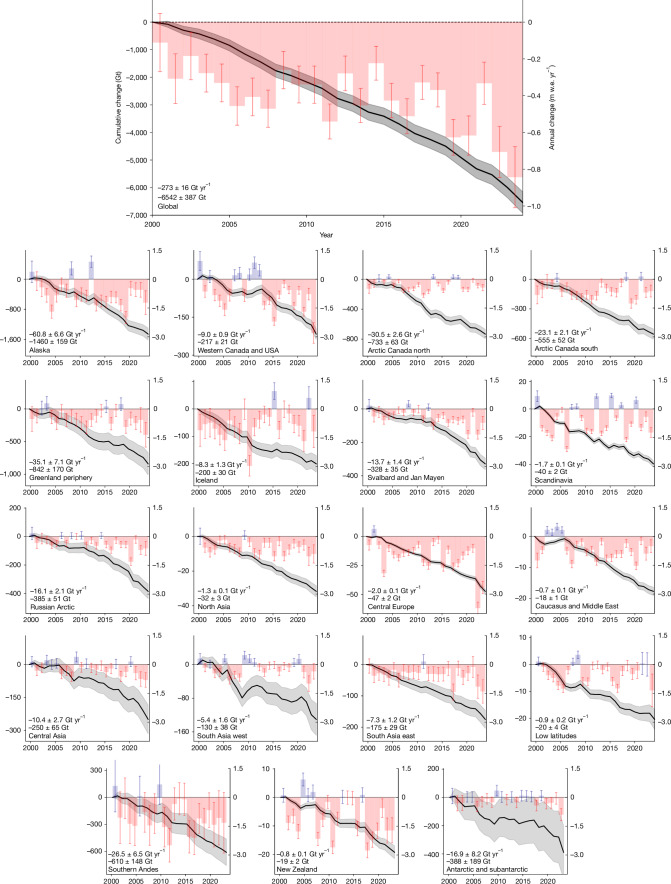 Glaciers are indicators of ongoing anthropogenic climate change1. Their melting leads to increased local geohazards2, and impacts marine3 and terrestrial4,5 ecosystems, regional freshwater resources6, and both global water and energy cycles7,8. Together with the Greenland and Antarctic ice sheets, glaciers are essential drivers of present9,10 and future11-13 sea-level rise. Previous assessments of global glacier mass changes have been hampered by spatial and temporal limitations and the heterogeneity of existing data series14-16. Here we show in an intercomparison exercise that glaciers worldwide lost 273 ± 16 gigatonnes in mass annually from 2000 to 2023, with an increase of 36 ± 10% from the first (2000-2011) to the second (2012-2023) half of the period. Since 2000, glaciers have lost between 2% and 39% of their ice regionally and about 5% globally. Glacier mass loss is about 18% larger than the loss from the Greenland Ice Sheet and more than twice that from the Antarctic Ice Sheet17. Our results arise from a scientific community effort to collect, homogenize, combine and analyse glacier mass changes from in situ and remote-sensing observations. Although our estimates are in agreement with findings from previous assessments14-16 at a global scale, we found some large regional deviations owing to systematic differences among observation methods. Our results provide a refined baseline for better understanding observational differences and for calibrating model ensembles12,16,18, which will help to narrow projection uncertainty for the twenty-first century11,12,18.