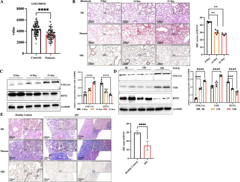 Background: As an endoplasmic reticulum (ER) protein, Reticulum 3 (RTN3) has been reported to play a crucial role in neurodegenerative diseases, lipid metabolism, and chronic kidney disease. The involvement of RTN3 in idiopathic pulmonary fibrosis (IPF), a progressive and fatal interstitial lung disease, remains unexplored.