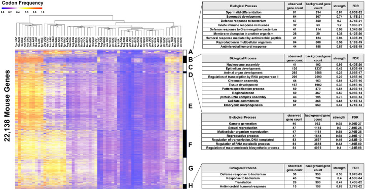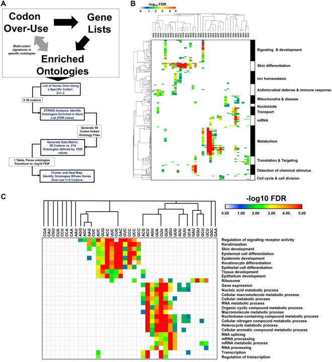 Arginine, glutamic acid and selenocysteine based codon bias has been shown to regulate the translation of specific mRNAs for proteins that participate in stress responses, cell cycle and transcriptional regulation. Defining codon-bias in gene networks has the potential to identify other pathways under translational control. Here we have used computational methods to analyze the ORFeome of all unique human (19,711) and mouse (22,138) open-reading frames (ORFs) to characterize codon-usage and codon-bias in genes and biological processes. We show that ORFeome-wide clustering of gene-specific codon frequency data can be used to identify ontology-enriched biological processes and gene networks, with developmental and immunological programs well represented for both humans and mice. We developed codon over-use ontology mapping and hierarchical clustering to identify multi-codon bias signatures in human and mouse genes linked to signaling, development, mitochondria and metabolism, among others. The most distinct multi-codon bias signatures were identified in human genes linked to skin development and RNA metabolism, and in mouse genes linked to olfactory transduction and ribosome, highlighting species-specific pathways potentially regulated by translation. Extreme codon bias was identified in genes that included transcription factors and histone variants. We show that re-engineering extreme usage of C- or U-ending codons for aspartic acid, asparagine, histidine and tyrosine in the transcription factors CEBPB and MIER1, respectively, significantly regulates protein levels. Our study highlights that multi-codon bias signatures can be linked to specific biological pathways and that extreme codon bias with regulatory potential exists in transcription factors for immune response and development.