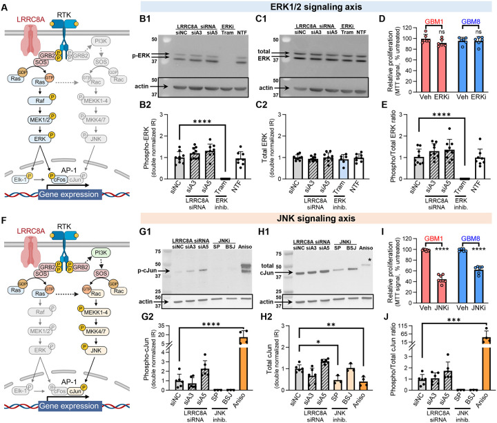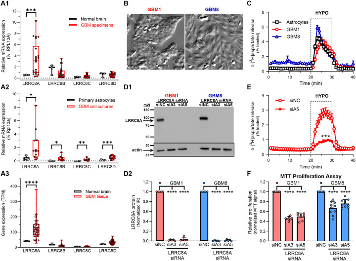Leucine-rich repeat-containing protein 8A (LRRC8A) is the essential subunit of ubiquitous volume-regulated anion channels (VRACs). LRCC8A is overexpressed in several cancers and promotes negative survival outcomes via a poorly defined mechanism. Here, we explored the role of LRRC8A and VRACs in the progression of glioblastoma (GBM), the most common and deadly primary brain tumor. We found that, as compared to healthy controls, LRRC8A mRNA was strongly upregulated in surgical GBM specimens, patient-derived GBM cell lines, and GBM datasets from The Cancer Genome Atlas (TCGA). Our in-silico analysis indicated that patients belonging to the lowest LRRC8A expression quartile demonstrated a trend for extended life expectancy. In patient-derived GBM cultures, siRNA-driven LRRC8A knockdown reduced cell proliferation and additionally decreased intracellular chloride levels and inhibited activity of mTOR complex 2. The antiproliferative effect of LRRC8A downregulation was recapitulated with a pharmacological inhibitor of VRAC. Our ensuing biochemical and molecular biology analyses established that the LRRC8A-containing VRACs facilitate GBM proliferation via a new mechanism involving non-enzymatic actions of the chloride-sensitive protein kinase WNK1. Accordingly, the chloride-bound WNK1 stimulates mTORC2 and the mTORC2-dependent protein kinases AKT and SGK, which promote proliferation. These findings establish the new mTORC2-centric axis for VRAC dependent regulation of cellular functions and uncover potential targets for GBM intervention.