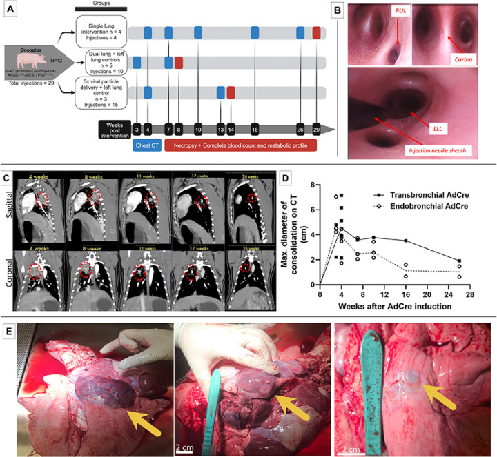 Methods: Twelve Oncopigs underwent 29 injections via flexible bronchoscopy. Eighteen Adenovirus-Cre recombinase gene (AdCre) inductions were performed endobronchially (n = 6) and transbronchially with a needle (n = 12). Eleven control injections were performed without AdCre. Oncopigs underwent serial contrast-enhanced chest CT with clinical follow-up for 29 weeks. Following autopsy, lung and organ tissues underwent histopathology, immunohistochemistry, and RNA-sequencing with comparative analysis with The Cancer Genome Atlas (TCGA) human LC data.