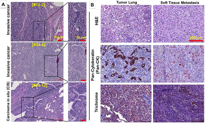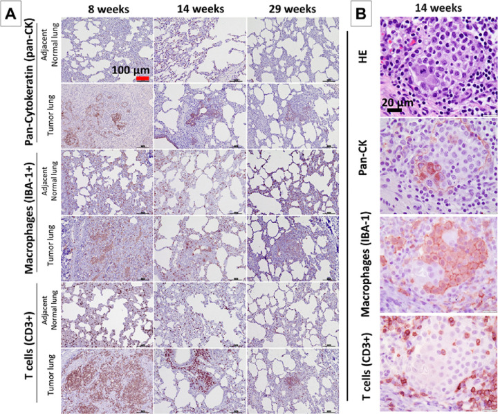 Results: All 18 sites of AdCre injections had lung consolidations on CT imaging. Transbronchial injections led to histopathologic invasive cancer and/or carcinoma in situ (CIS) in 11/12 (91.7%), and invasive cancer (excluding CIS) in 8/12 (66.6%). Endobronchial inductions led to invasive cancer in 3/6 (50%). A soft tissue metastasis was observed in one Oncopig. Immunohistochemistry confirmed expression of Pan-CK+/epithelial cancer cells, with macrophages and T cells infiltration in the tumor microenvironment. Transcriptome comparison showed 54.3% overlap with human LC (TCGA), in contrast to 29.88% overlap of KRAS-mutant mouse LC with human LC.