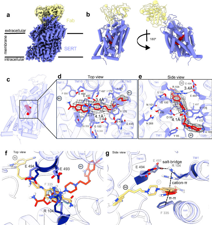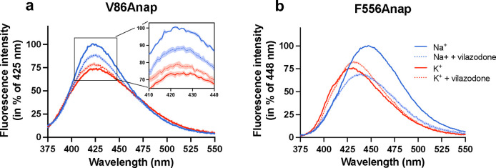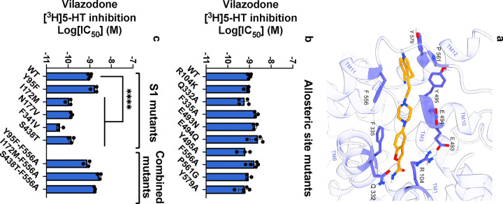 The serotonin transporter (SERT) plays a pivotal role in regulating serotonin (5-HT) signaling and is a key target in treating psychiatric disorders. SERT has a binding site (S1) for 5-HT that also serves as a high-affinity binding site for antidepressants. The antidepressant vilazodone has been shown to inhibit SERT by binding to an allosteric site. Here, we present the cryo-EM structure of SERT with vilazodone bound to the S1 site and extending towards the allosteric site. We systematically dissect the vilazodone molecule into fragments and find that the terminal indole ring is the key determinant for its high affinity to SERT. Further, unlike typical Na+-dependent SERT-selective antidepressants, vilazodone exhibits a dissociation constant (K D) for purified SERT in the nanomolar range both in the presence or absence of Na+. We substantiate this binding mode by exploring the conformational impact of vilazodone binding to SERT using site-specific insertion of the fluorescent non-canonical amino acid Anap. Our results offer novel molecular insight into the distinct pharmacological profile of a clinically used polymodal antidepressant.