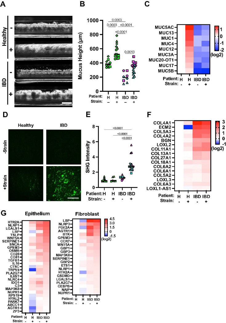 Inflammatory bowel disease (IBD) patients exhibit compromised intestinal barrier function and decreased mucus accumulation, as well as increased inflammation, fibrosis, and cancer risk, with symptoms often being exacerbated in women during pregnancy. Here, we show that these IBD hallmarks can be replicated using human Organ Chips lined by IBD patient-derived colon epithelial cells interfaced with matched fibroblasts cultured under flow. Use of heterotypic tissue recombinants revealed that IBD fibroblasts are the primary drivers of multiple IBD symptoms. Inflammation and fibrosis are accentuated by peristalsis-like motions in IBD Chips and when exposed to pregnancy-associated hormones in female IBD Chips. Carcinogen exposure also increases inflammation, gene mutations, and chromosome duplication in IBD Chips, but not in Healthy Chips. These data enabled by human Organ Chip technology suggest that the intestinal stroma, sex hormones, and peristalsis-associated mechanical deformations play a key role in driving inflammation, fibrosis, and disease progression in male and female IBD patients.
