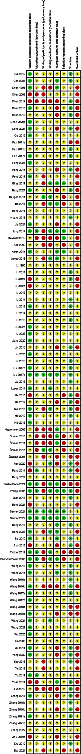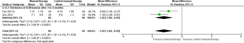 Results: One hundred studies (80 from China) involving 8125 participants published between 1990 and 2023 were included. Adding manual therapy to an active control resulted in short-term improvements in passive cervical rotation (odds ratio (OR) 9.79, 95%CI 4.26,22.50), passive cervical lateroflexion (OR 2.66, 95%CI 1.17,6.04), active cervical rotation (OR 3.94, 95%CI 1.08,14.35), symmetric head posture (OR 4.55, 95%CI 2.57,8.05), sternocleidomastoid tumour thickness (mean difference (MD) -2.12 mm, 95%CI -2.98,-1.26) and development of symmetrical movement (standardised MD -0.70, 95%CI -0.95,-0.45). The addition of an electrophysical agent to an active control reduced sternocleidomastoid tumour thickness (MD -2.03 mm, 95%CI -2.67,-1.39) and optimised Tuina reduced tumour thickness more than traditional Tuina (MD -1.20 mm, 95%CI -1.80,-0.59). Adverse events were uncommon but poorly reported, with 71 (71%) of studies providing no data. Study heterogeneity limited pooling of data for meta-analysis, and there was very low to low certainty evidence for all results, due to high risk of bias, small sample sizes and study heterogeneity.