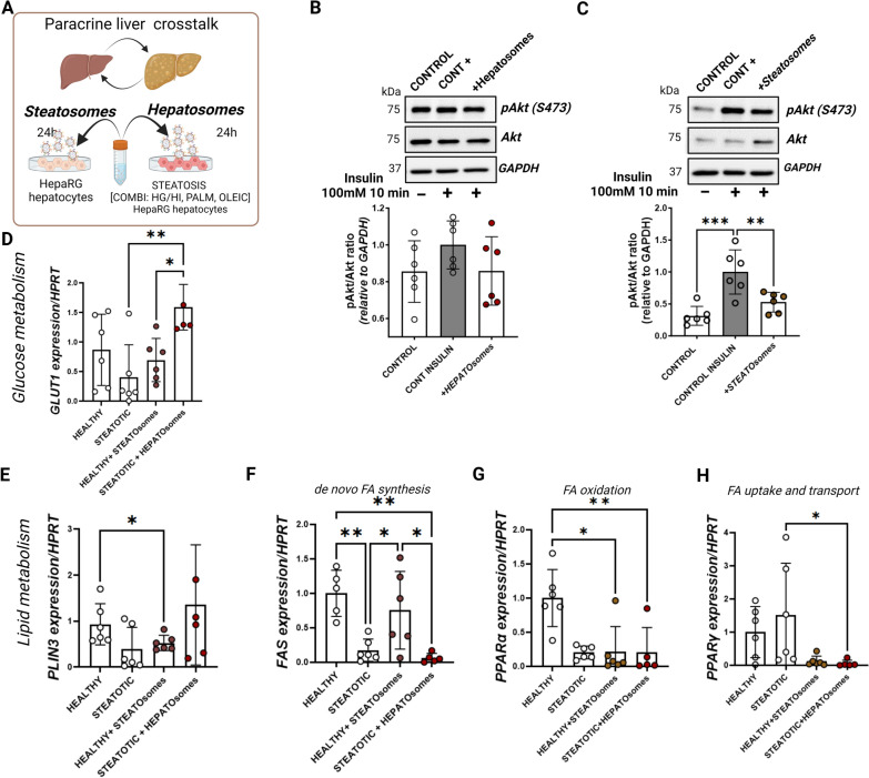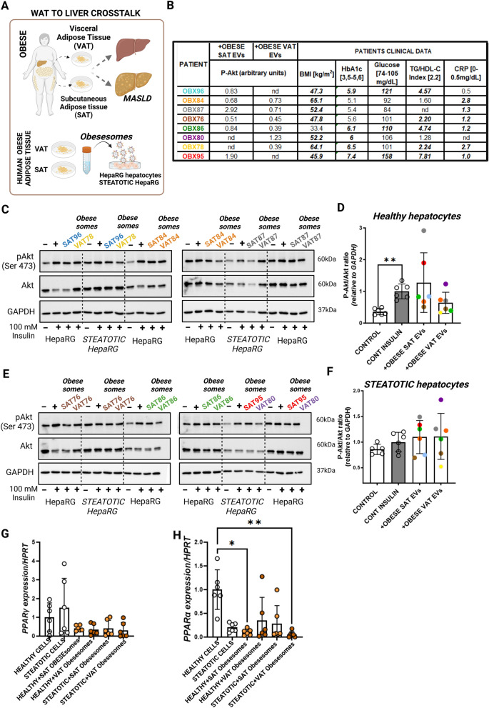 Results and conclusions: In this study, we investigated the role of EVs in the local communication between obese adipocytes and immune cells within adipose tissue, and the interaction of steatotic and healthy hepatocytes in the context of fatty liver disease progression. Furthermore, we analyzed obese adipose tissue-to-liver interactions through EV-obesesomes to elucidate their role in obesity-associated hepatic metabolic dysregulation. Our findings reveal that obesesomes promote inflammation and the secretion of pro-inflammatory cytokines upon interaction with macrophages, exerting a significant impact on reducing insulin resistance and altering lipid and glucose metabolism upon interaction with hepatocytes; in both cases, EVs from palmitate-loaded adipocytes and obesesomes from human visceral adipose depots demonstrated the most deleterious effect. Additionally, EVs secreted by steatotic hepatocytes (steatosomes) induced insulin resistance and altered lipid and glucose metabolism in healthy hepatocytes, suggesting their involvement in MASLD development. Proteomic analysis of steatosomes revealed that these vesicles contain liver disease-associated proteins, rendering them significant repositories of real-time biomarkers for the early stages and progression of MASLD.