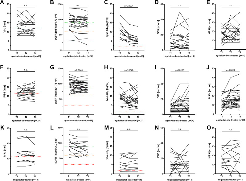Results: Treatment with agalsidase-beta, agalsidase-alfa, and migalastat was safe and severe adverse events were rare. Newly and long-term-treated patients presented a stable disease course over time. None of the patients required hospitalization due to cardiac events. Overall septum thickness remained stable in all groups (p > 0.05). Estimated glomerular filtration rate (eGFR) only slightly decreased in patients treated with agalsidase-alfa [newly- and long-term-treated: -1.5 ± 3.2 and - 1.3 ± 3.9 ml/min/1.73 m²/year; p = 0.0056 and p = 0.0187, respectively] but the decrease was in the range of natural eGFR decline. eGFRs in agalsidase-beta and migalastat-treated patients were stable. No clinically relevant differences concerning treatment efficacy between agalasidase-beta, agalsidase-alfa, and migalastat were detected.