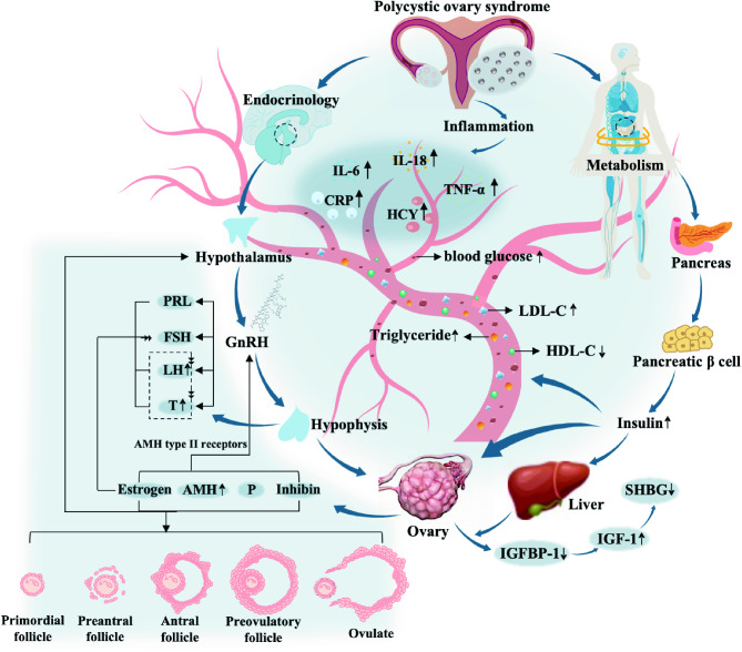 Polycystic ovary syndrome (PCOS) is a prevalent endocrine disorder characterized by elevated androgen levels, ovarian cysts, and impaired ovulation in females. This condition is closely linked with various reproductive health issues and has significant impacts on endocrine and metabolic pathways. Patients with PCOS commonly exhibit hyperandrogenaemia and insulin resistance, leading to complications such as acne, hirsutism, weight fluctuations, and metabolic disturbances, as well as an increased risk for type 2 diabetes, cardiovascular disease, and endometrial cancer. Although extensive research has identified several mechanistic aspects of PCOS, a thorough understanding of its pathophysiology remains incomplete. This review aims to provide a detailed analysis of the physiological and pathological aspects of PCOS, covering endocrine, metabolic, and inflammatory dimensions, to better elucidate its etiological framework.