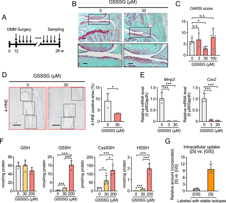 The physiological functions of supersulfides, inorganic and organic sulfides with sulfur catenation, have been extensively studied. Their synthesis is mainly mediated by mitochondrial cysteinyl-tRNA synthetase (CARS2) that functions as a principal cysteine persulfide synthase. This study aimed to investigate the role of supersulfides in joint homeostasis and bone regeneration. Using Cars2AINK/+ mutant mice, in which the KIIK motif of CARS2 essential for supersulfide production was replaced with AINK, we evaluated the role of supersulfides in fracture healing and cartilage homeostasis during osteoarthritis (OA). Tibial fracture surgery was performed on the wild-type (Cars2+/+) and Cars2AINK/+ mice littermates. Bulk RNA-seq analysis for the osteochondral regeneration in the fracture model showed increased inflammatory markers and reduced osteogenic factors, indicative of impaired bone regeneration, in Cars2AINK/+ mice. Destabilization of the medial meniscus (DMM) surgery was performed to produce the mouse OA model. Histological analyses with Osteoarthritis Research Society International and synovitis scores revealed accelerated OA progression in Cars2AINK/+ mice compared with that in Cars2+/+ mice. To assess the effects of supersulfides on OA progression, glutathione trisulfide (GSSSG) or saline was periodically injected into the mouse knee joints after the DMM surgery. Thus, supersulfides derived from CARS2 and GSSSG exogenously administered significantly inhibited inflammation and lipid peroxidation of the joint cartilage, possibly through suppression of ferroptosis, during OA development. This study represents a significant advancement in understanding anti-inflammatory and anti-oxidant functions of supersulfides in skeletal tissues and may have a clinical relevance for the bone healing and OA therapeutics.
