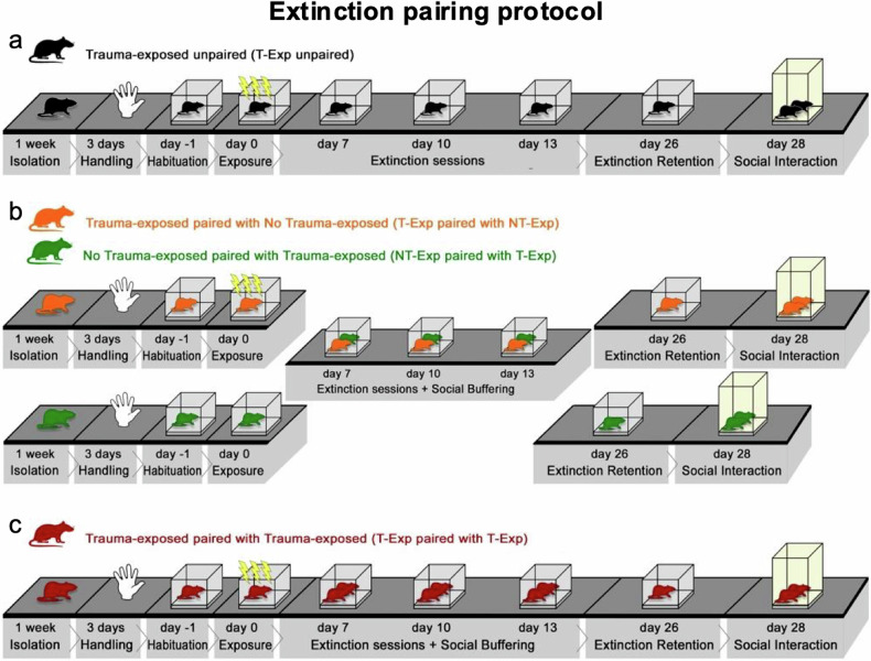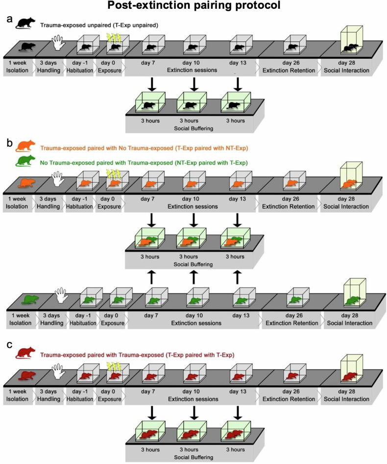 Post-Traumatic Stress Disorder (PTSD) is a psychiatric disease that may develop after experiencing a traumatic event and it is characterized by resistance to extinction of the traumatic memory. Psychotherapy, which mainly focuses on favoring fear memory extinction, represents the first-line treatment for PTSD. However, this approach is not always successful. Emerging evidence suggests the importance of a social support in alleviating PTSD symptomatology; however, the efficacy of group therapy for PTSD remains controversial. Here, we evaluated the impact of social support on the efficacy of fear extinction sessions in a chronic PTSD-like rat model. We tested the hypothesis that the presence of a social partner during temporally spaced extinction sessions (to mimic the presence of a social support during therapy) or after the extinction sessions in a neutral environment (to mimic the presence of a social support outside of the therapy setting) would ameliorate long-term PTSD-like symptomatology. Extinction sessions were carried out under different conditions: (i) alone; (ii) with a social partner never exposed to the trauma; (iii) with a trauma-exposed partner. In a separate set of experiments, rats were exposed to the extinction sessions alone and, immediately thereafter, paired with a social partner, as indicated above, in a different context. Extinction sessions carried out in the presence of a social partner never exposed to the traumatic experience rescued long-term trauma-induced PTSD-like symptomatology. We provide evidence of beneficial effects of a "healthy" social support during extinction sessions in ameliorating both immediate and persistent over time cognitive and emotional PTSD-like symptoms.