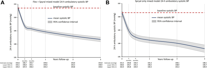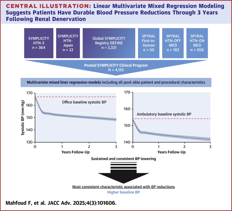 Results: The mixed model included data from 4,155 patients treated with the Symplicity RDN system. The mean age was 60 ± 12 years, 40.4% of whom were female. Estimated, longitudinal office and 24-h ambulatory SBP changes through 36 months, after adjusting for AH medication effects, were biphasic, with a steep reduction after RDN through the first 6 months followed by continuous and steady reductions in office and 24-h SBP and DBP afterward through 36 months. Higher baseline office systolic or 24-h ambulatory SBP were correlated with greater reductions through follow-up in office and 24-h SBP, respectively. Patient characteristics consistent with high sympathetic nerve activity, such as atrial fibrillation and type 2 diabetes, emerged as statistically significant covariates associated with greater office systolic and office and 24-h diastolic BP reductions, respectively.