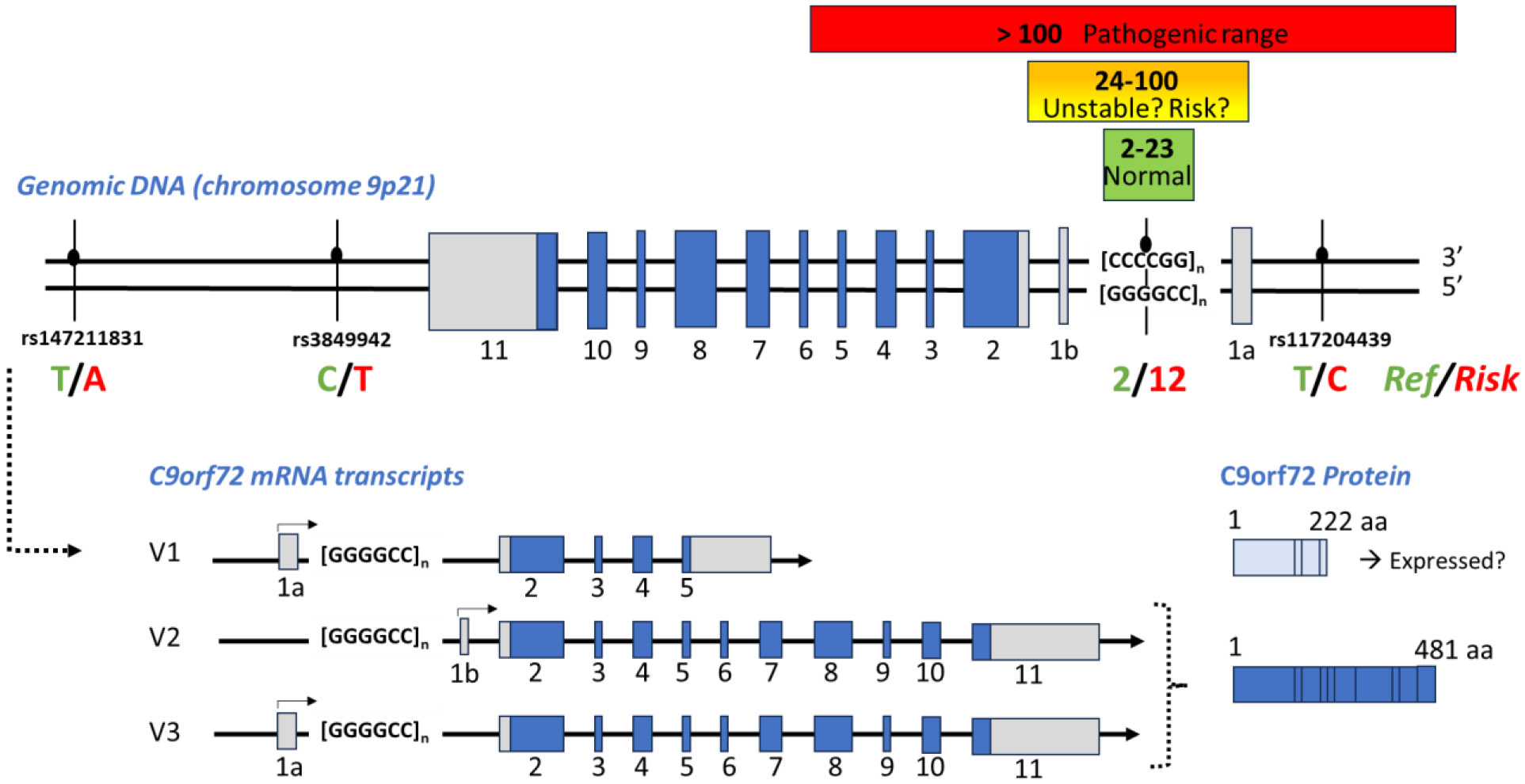 GGGGCC repeat expansions in C9orf72 are a common genetic cause of amyotrophic lateral sclerosis in people of European ancestry; however, substantial variability in the penetrance of the mutation, age at disease onset, and clinical presentation can complicate diagnosis and prognosis. The repeat expansion is bidirectionally transcribed in the sense and antisense directions into repetitive RNAs and translated into dipeptide repeat proteins, and both accumulate in the cortex, cerebellum, and the spinal cord. Furthermore, neuropathological aggregates of phosphorylated TDP-43 are observed in motor cortex and other cortical regions, and in the spinal cord of patients at autopsy. C9orf72 repeat expansions can also cause frontotemporal dementia. The GGGGCC repeat induces a complex interplay of loss-of-function and gain-of-function pathological mechanisms. Clinical trials using antisense oligonucleotides to target the GGGGCC repeat RNA have not been successful, potentially because they only target a single gain-of-function mechanism. Novel therapeutic approaches targeting the DNA repeat expansion, multiple repeat-derived RNA species, or downstream targets of TDP-43 dysfunction are, however, on the horizon, together with the development of diagnostic and prognostic biomarkers.