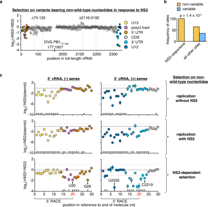 Influenza A virus encodes conserved promoter sequences. Using minimal replication assays-transfections with viral polymerase, nucleoprotein, and a genomic template-these sequences were identified as 13nt at the 5' end of the genomic RNA (U13) and 12nt at the 3' end (U12). Other than the fourth 3' nucleotide, the U12 and U13 sequences are identical between all eight RNA molecules of the segmented influenza A genome. However, individual segments can exhibit different dynamics during infection. Influenza NS2, which modulates transcription and replication differentially between genomic segments, may provide an explanation. Here, we assess how internal sequences of two genomic segments, HA and PB1, contribute to NS2-dependent replication and map such interactions down to individual nucleotides in PB1. We find that the expression of NS2 significantly alters sequence requirements for efficient replication beyond the identical U12 and U13 sequences, providing a potential mechanism for segment-specific replication dynamics across the influenza genome.