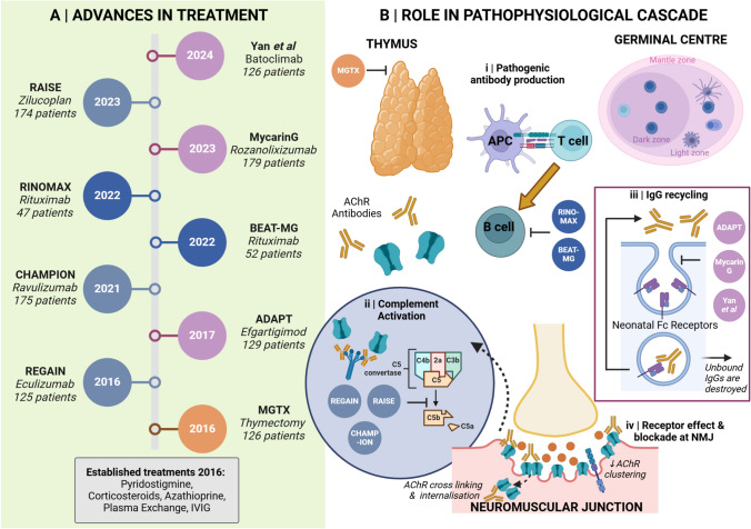 The last 10 years has brought transformative developments in the effective treatment of myasthenia gravis (MG). Beginning with the randomized trial of thymectomy in myasthenia gravis that demonstrated efficacy of thymectomy in nonthymomatous MG, several new treatment approaches have completed successful clinical trials and regulatory launch. These modalities, including B cell depletion, complement inhibition, and blockade of the neonatal Fc receptor, are now in use, offering prospects of sustained remission and neuromuscular protection in what is a long-term disease. In this review, we update our clinico-immunological review of 2016 with these important advances, examine their role in treatment algorithms, and focus attention on key issues of biomarkers for prognostication and the growing cohort of older patients, both those with long-term disease, and late-onset MG ('LOMG'). We close by expressing our four hopes for the next 5-10 years: improvements in laboratory medicine to facilitate rapid diagnosis, effective strategies for neuromuscular protection, more research into and better understanding of pathophysiology and treatment response in older individuals, and the potentially transformative role of therapies aimed at delivering a durable response such as chimeric antigen receptor (CAR) T cells. Our postscript summarizes some emerging themes in the field of serological and online biomarkers, which may develop greater stature in the next epoch.