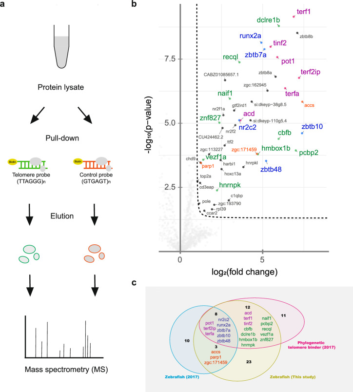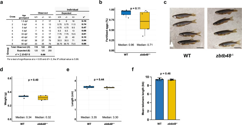 ZBTB48 (also known as TZAP) is a transcription factor that has previously been reported to bind to telomeres and act as a negative regulator of telomere length in human cell lines. To explore whether transcription factor activity and telomere length regulation are conserved at the organismal level in vertebrates, we generate a zbtb48-/- zebrafish line via CRISPR‒Cas genome editing. The zbtb48-/- mutants display no obvious physical or behavioral abnormalities in the first two generations. We find no statistically significant changes in telomere length in first-generation adults. However, for the gene regulatory aspect of Zbtb48, similar to that in human cancer cell lines, we observe downregulation of mtfp1 at both the mRNA and protein levels in the zbtb48-/- mutants. This suggests that mtfp1 is an evolutionarily conserved regulatory target of Zbtb48. Further investigation of the spatiotemporal expression of zbtb48 in previously published zebrafish data reveals low transcript expression in diverse tissues, except in germline stem cells and gametocytes of the gonads. Notably, Mtfp1 protein downregulation is detected in the ovaries of 40 dpf zbtb48-/- mutants and in the testes of both 40 dpf and 10.5-month-old zbtb48-/- mutants.