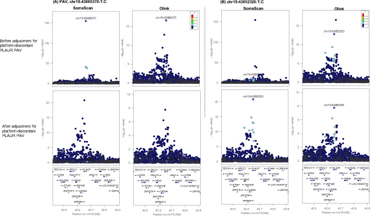 Measures from affinity-proteomics platforms often correlate poorly, challenging interpretation of protein associations with genetic variants (pQTL) and phenotypes. Here, we examined 2,157 proteins measured on both SomaScan 7k and Olink Explore 3072 across 1,930 participants with genetic similarity to European, African, East Asian, and Admixed American ancestry references. Inter-platform correlation coefficients for these 2,157 proteins followed a bimodal distribution (median r=0.30). Protein measures from each platform were associated with genetic variants (pQTLs), and one-third of the pQTL signals were driven by protein-altering variants (PAVs). We highlight 80 proteins that correlate differently across ancestry groups likely due to differing PAV frequencies by ancestry. Furthermore, adjustment for PAVs with opposite directions of effect by platform improved inter-platform protein measure correlation and resulted in more concordant genetic and phenotypic associations. Hence, PAVs need to be accounted for across ancestries to facilitate platform-concordant and accurate protein measurement.