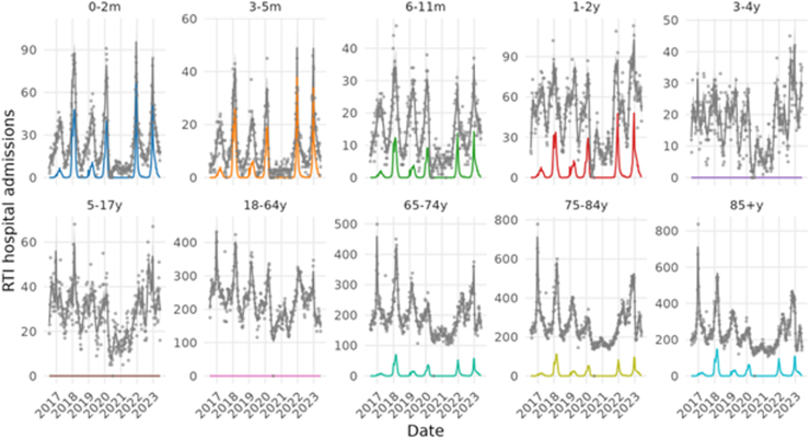 Interpretation: RSV-attributed time series exhibit a high degree of synchronicity between participating countries, suggesting that this method for attribution addresses the known issues with underdiagnosis and misclassification. In the older age groups, a substantial proportion of RTI hospitalisations is attributed to RSV, underscoring the relevance of RSV as a cause of severe respiratory infections.