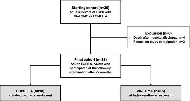 Results: This study included 33 ECPR survivors, who were predominantly male (70%) with a mean age of 55 years. Left-ventricular ejection fraction improved significantly, from 22% during ICU stay to 51% at follow-up in the ECMELLA group and from 31% to 51% in the VA-ECMO group (p = 0.006). Many patients reported dizziness or dyspnea (>52%) during daily activities, with a median New York Heart Association class of 2, EQ-5D-5L score of 53 and elevated NT-proBNP levels. Despite normal neurological scores, 46% had memory issues, 39% struggled with daily organization, 52% had depression and 12% had suicidal thoughts. Physical performance was reduced, with a mean distance of 394 meters in the 6-minute walk test and a 6-minute bicycle ergometry time.