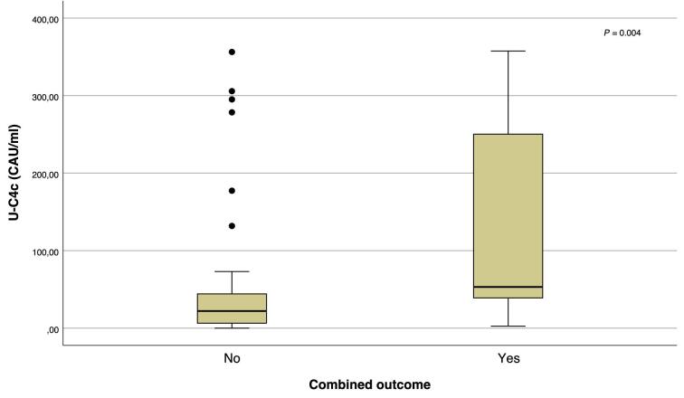 Results: Patients with detectable vs undetectable u-PTX-3 and u-mannose-binding lectin (MBL) more frequently had mesangial hypercellularity, endocapillary proliferation, and crescents in their kidney biopsy. u-C4c levels were higher in patients with advanced tubulointerstitial fibrosis, and u-C4c was also an independent predictor of a more severe eGFR slope. There were no differences in the levels of biomarkers between patients with IgAN and IgAVN.