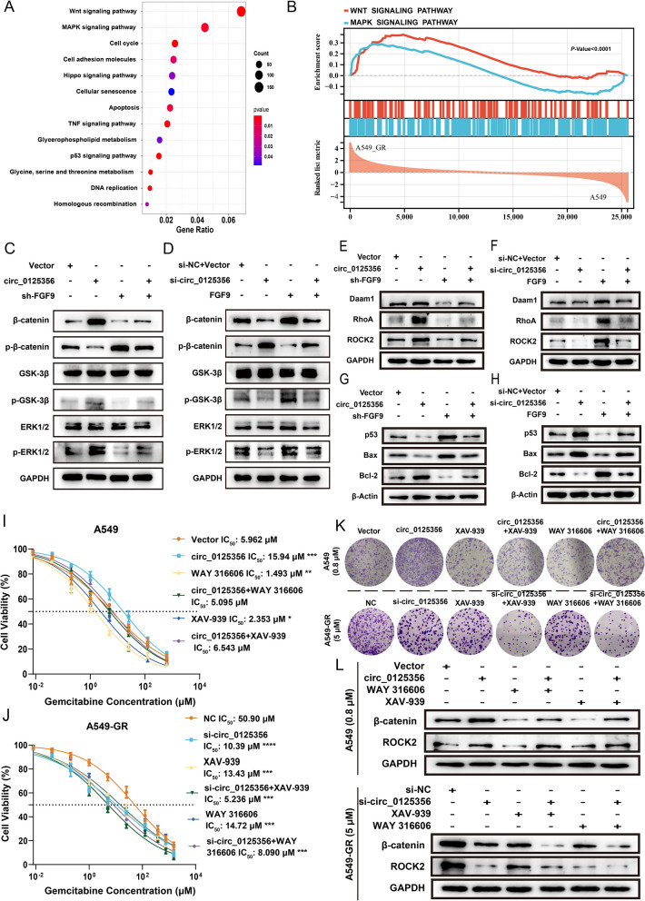Results: We identified a novel hsa_circ_0125356 as a therapeutic target against gemcitabine resistance. Hsa_circ_0125356 was significantly elevated in clinical samples of patients with NSCLC. Moreover, hsa_circ_0125356 overexpression promoted gemcitabine resistance to NSCLC by upregulating FGF9 via sponging miR-582-5p in vivo and in vitro. Notably, WNT canonical (ERK/GSK3β/β-catenin) and non-canonical (Daam1/RhoA/ROCK2) signaling pathways were activated due to hsa_circ_0125356 acting as an endogenous miR-582-5p sponge to regulate the expression of FGF9, and thereby enhancing gemcitabine resistance via promoting DNA damage repair and inhibition of apoptosis. The results were further confirmed by two small molecule antagonists, WAY 316606 and XAV-939,which could inhibit the activation of WNT signaling pathway induced by hsa_circ_0125356.