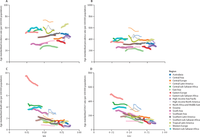 Methods: Using well established Global Burden of Diseases, Injuries, and Risk Factors Study (GBD) methodology, we quantified the prevalence of active idiopathic (epilepsy of genetic or unknown origin) and secondary epilepsy (epilepsy due to an underlying abnormality of the brain structure or chemistry), as well as incidence, death, and disability-adjusted life-years (DALYs) by age, sex, and location (globally, 21 GBD regions and seven super-regions, World Bank country income levels, Socio-demographic Index [SDI], and 204 countries) and their trends from 1990 to 2021. Vital registrations and verbal autopsies provided information about deaths, and data on the prevalence and severity of epilepsy, largely came from population representative surveys. All estimates were calculated with 95% uncertainty intervals (UIs).