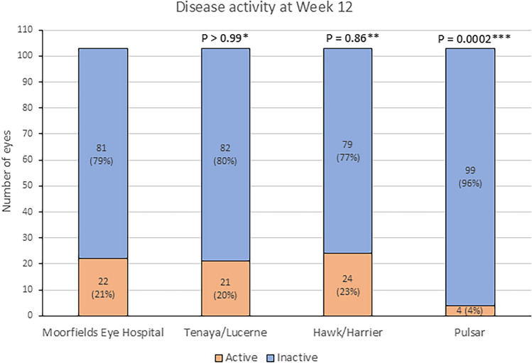 Results: At 12 weeks, 79% of patients had injection intervals extended in clinical practice compared to 80% when applying hypothetical TENAYA/LUCERNE disease activity criteria; 77% using HAWK/HARRIER and 96% using PULSAR. There was agreement between clinical practice and all clinical trials in 60% of eyes, and no agreement in 13%. At 12 months, fewer patients were inactive, with 55% of eyes quiescent in clinical practice, 58% when applying TENAYA/LUCERNE criteria and 67% using HAWK/HARRIER. Application of PULSAR disease activity criteria showed 96% of patients were classed as inactive. 34% of eyes showed agreement in disease activity status between clinical practice and all clinical trials at 12 months, with no agreement in 20%.