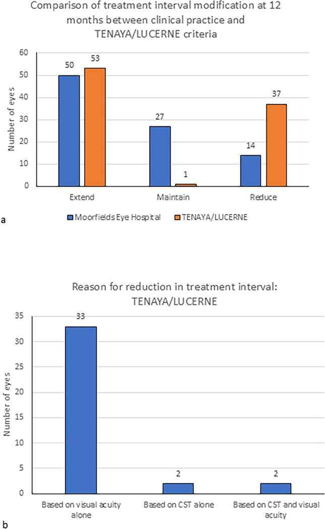 Methods: Data were analysed from 105 treatment-naïve patients with nAMD who received anti-VEGF injections at Moorfields Eye Hospital. Disease activity criteria from TENAYA/LUCERNE, HAWK/HARRIER and PULSAR clinical trials were applied to determine the hypothetical impact on the decision to modify injection intervals at week 12 (fourth injection) and 12-month real-world clinic visits.