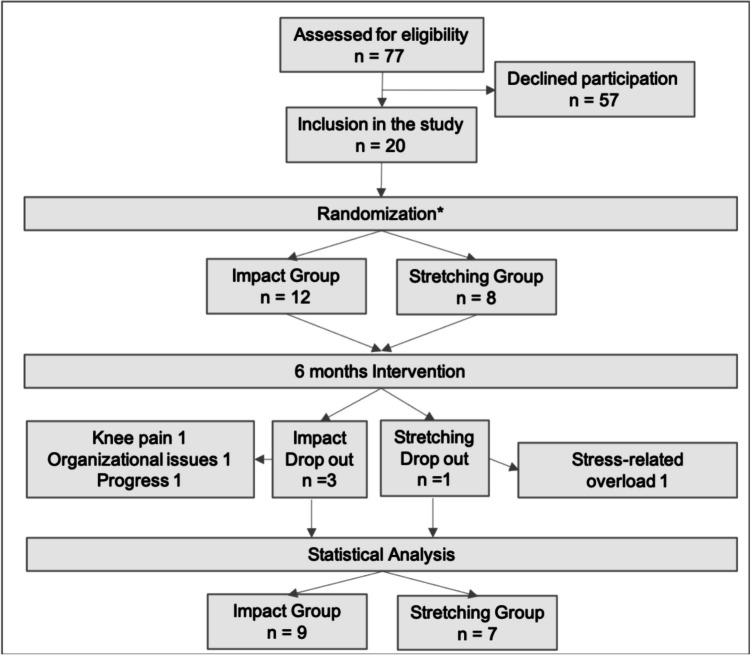 Methods: We assigned 20 patients to perform 45 min of guided impact-loading exercise twice a week and home-based training once a week or stretching exercise twice a week. Primary endpoint was assessment of feasibility and safety. Secondary endpoints were assessments of physical performance, quality of life, and bone remineralization.