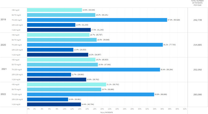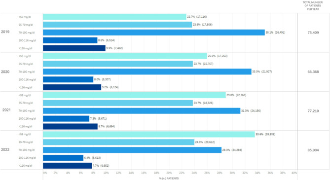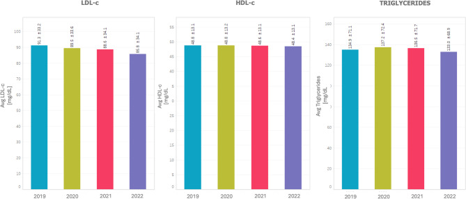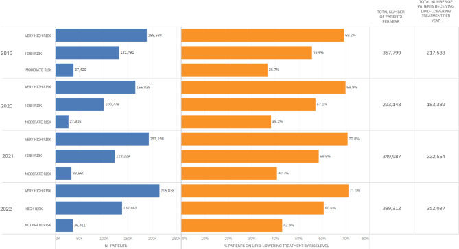 Results: The percentage of patients achieving LDL-c targets improved across all risk levels. In very high-risk patients, LDL-c < 55 mg/dL was achieved by 16.3% in 2019, increasing to 23.6% in 2022. High-risk patients achieving LDL-c < 70 mg/dL rose from 20.3 to 26.6% over the same period. Use of PCSK9 inhibitors, particularly in combination with statins, was associated with the highest target achievement rates, reaching 62% in very high-risk patients by 2022. We observed a reduction of moderate-intensity statins use in favor of combination therapies across the four years. Despite this, nearly one-third of patients still had LDL-c levels ≥ 100 mg/dL in 2022.