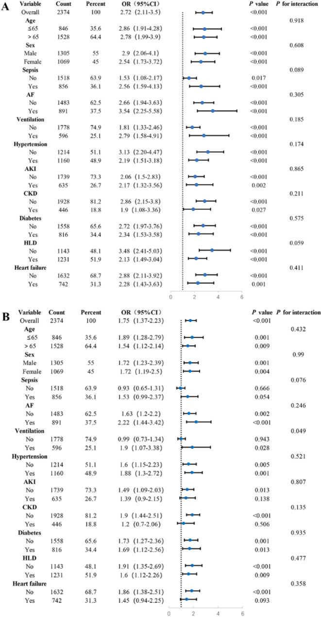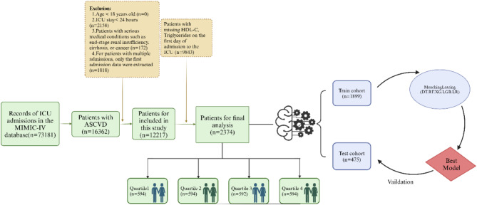 Results: The study enrolled a total of 2423 patients with critically ill ASCVD, predominantly male (54.91%), and revealed that higher AIP values were independently associated with longer ICU and hospital stays. Specifically, for each unit increase in AIP, the odds of prolonged ICU and hospital stays were significantly higher, with adjusted odds ratios (OR) of 1.42 (95% CI, 1.11-1.81; P = 0.006) and 1.73 (95% CI, 1.34-2.24; P < 0.001), respectively. The RCS regression demonstrated a linear relationship between increasing AIP and both ICU LOS and hospital LOS. ML models, specifically LGB (ROC:0.740) and LR (ROC:0.832) demonstrated superior predictive accuracy for these endpoints, identifying AIP as a vital component of hospitalization duration.