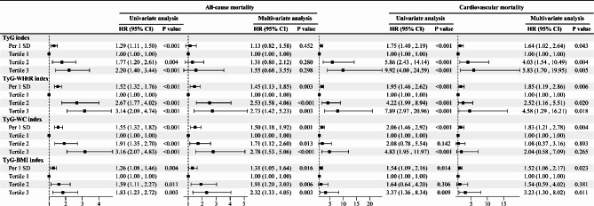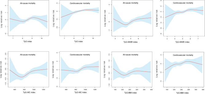 Results: In survey-weighted multifactorial regression analyses, a significant positive association existed between TyG, TyG-related indices, and both all-cause mortality and cardiovascular mortality, except for the TyG index, which did not demonstrate a significant link with all-cause mortality. Of these indices, the TyG-WC index exhibited the strongest correlation with all-cause mortality, with a hazard ratio (HR) of 1.50 and a 95% confidence interval (CI) of 1.18-1.92, followed by the TyG-WHtR index (HR: 1.45, 95%CI 1.13-1.85). The TyG-WHtR index demonstrated the strongest correlation with cardiovascular mortality (HR: 1.85, 95% CI 1.19-2.86), followed by the TyG-WC index(HR: 1.83, 95%CI 1.21-2.78). An L-shaped association was identified between TyG-WHtR, TyG-BMI, and all-cause mortality in CKM syndrome during the examination of nonlinear relationships (both P for log-likelihood ratio < 0.05). The TyG-WHtR, TyG-WC, and TyG-BMI indices exhibited a more pronounced correlation with all-cause mortality in those with CKM syndrome stages 1 and 3 (P value < 0.05, P for interaction < 0.05).