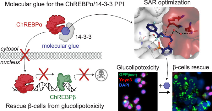 The Carbohydrate Response Element Binding Protein (ChREBP) is a glucose-responsive transcription factor (TF) with two major splice isoforms (α and β). In chronic hyperglycemia and glucolipotoxicity, ChREBPα-mediated ChREBPβ expression surges, leading to insulin-secreting β-cell dedifferentiation and death. 14-3-3 binding to ChREBPα results in cytoplasmic retention and suppression of transcriptional activity. Thus, small molecule-mediated stabilization of this protein-protein interaction (PPI) may be of therapeutic value. Here, we show that structure-based optimizations of a 'molecular glue' compound led to potent ChREBPα/14-3-3 PPI stabilizers with cellular activity. In primary human β-cells, the most active compound retained ChREBPα in the cytoplasm, and efficiently protected β-cells from glucolipotoxicity while maintaining β-cell identity. This study may thus not only provide the basis for the development of a unique class of compounds for the treatment of Type 2 Diabetes but also showcases an alternative 'molecular glue' approach for achieving small molecule control of notoriously difficult to target TFs.