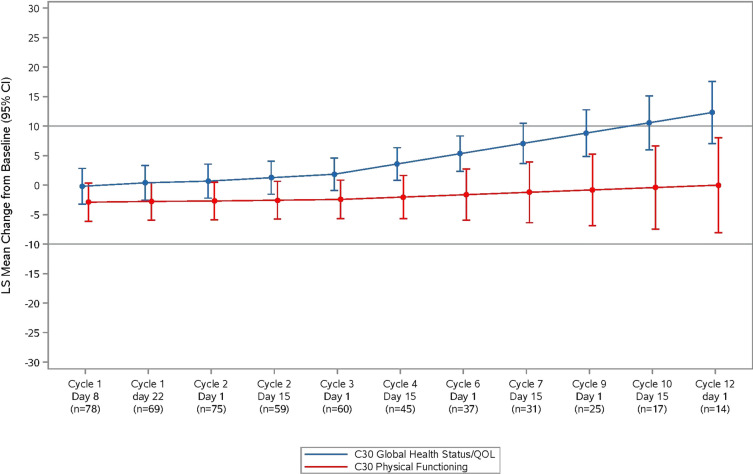 Methods: Patients received tarlatamab intravenously every 2 weeks at a dose of 10 mg (regulatory approved dose) or 100-mg until progression or loss of benefit. PROs, including European Organization for Research and Treatment of Cancer 30-item Quality of Life Questionnaire (EORTC-QLQ-C30) and 13-item lung cancer module (LC13), Patient-Reported Outcomes Version of the Common Terminology Criteria for Adverse Events (PRO-CTCAE), and the GP5 question of the Functional Assessment of Cancer Therapy - General Form (FACT-GP5), were collected at Cycle 1 (days 1, 8, 22), Cycle 2 (days 1, 15) and every 6 weeks from Cycle 3 onwards. PROs were summarized descriptively alongside the amount and reason for missing data and analyzed using a mixed model for repeated measures. In addition, median time to deterioration (TTD) for symptom and functional scales was analyzed.