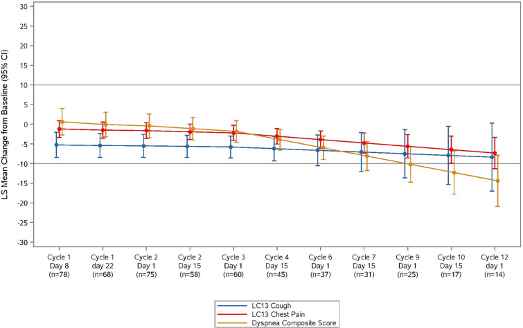 Results: A total of 100 patients were PRO-evaluable at the selected target dose (10 mg). EORTC-QLQ-C30 and LC13 completion rates (proportion of PRO assessments expected to be completed) were high (> 80%) throughout the study. Least square mean changes from baseline showed a trend towards improvement for the QLQ-C30 subscale of global health status and stabilization for physical functioning. Patients experienced reduced symptom burden for dyspnea which was more pronounced for patients at later cycles (≥ 10 points), and stabilization for chest pain and cough. Median TTD exceeded 6 months for cough and dyspnea and was not estimable for chest pain. Overall, tarlatamab was well tolerated with the majority of patients reporting no bother or a little bit of bother from side effects post baseline. Patient-reported adverse events were generally of mild to moderate severity occurring rarely or occasionally.