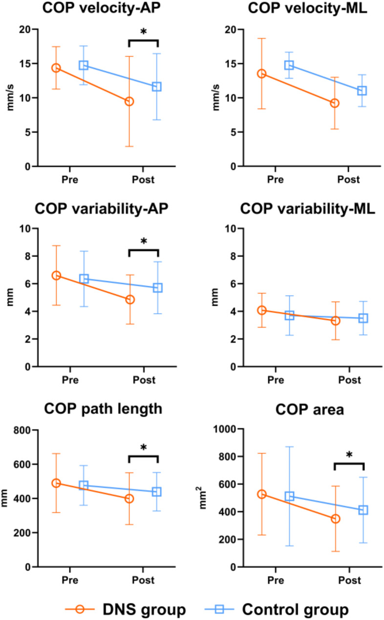 Results: After 4 weeks, comparisons between both groups revealed significant statistical differences in the interaction effects of time*group. These differences were observed in the change rates of the left and right TrA (F1,58=4.820 and 3.964, p = 0.032 and 0.041), diaphragm change rate (F1,58=11.945, p = 0.001), as well as COP velocity (F1,58=5.283, p = 0.025), variability (F1,58=13.189, p = 0.001) in the anterior-posterior (AP) direction, COP path length (F1,58=6.395, p = 0.014), and COP area (F1,58=5.038, p = 0.029) in the eye-closed condition. DNS participants showed significantly greater muscle change rates and reduced COP (p < 0.05). The scores of VAS (F1,58=173.929, p = 0.001), ODI (F1,58=60.871, p = 0.001), and RDQ (F1,58=60.015, p = 0.001) decreased significantly over time, although no group differences were found between both groups (p > 0.05).