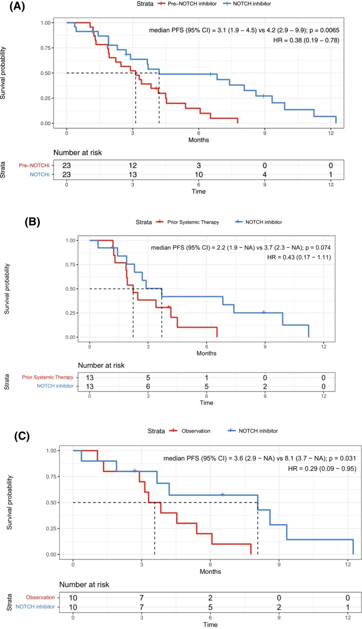 Results: Twenty-nine patients were included, with a predominance of solid histology (86%). NOTCH-activating mutations were identified in 82% of patients, and 95% showed positive NICD1 staining. BOR revealed partial response in 17% of patients, stable disease in 55%, and progressive disease in 28%. Median response duration was longer for AL101 compared to brontictuzumab (9.9 vs. 1.7 months, p = 0.04). Median PFS with NOTCH inhibitor was 4.2 months (95% CI 2.7-8.6 months). Progression of nontarget lesions occurred in 34% of patients. Comparison with prior therapy showed longer PFS with NOTCH inhibitors (HR 0.38, 95% CI 0.19-0.78, p = 0.0065).