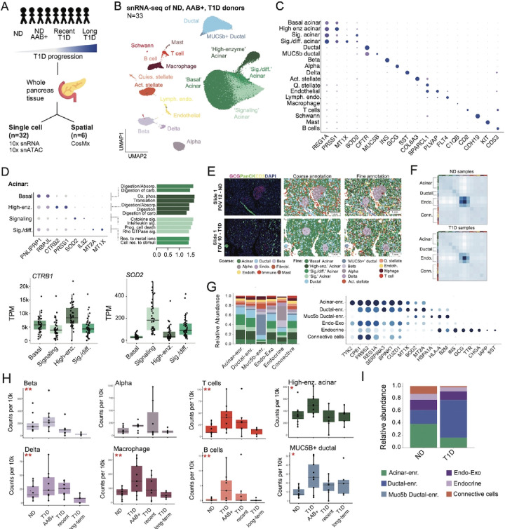 Cell type-specific regulatory programs that drive type 1 diabetes (T1D) in the pancreas are poorly understood. Here we performed single nucleus multiomics and spatial transcriptomics in up to 32 non-diabetic (ND), autoantibody-positive (AAB+), and T1D pancreas donors. Genomic profiles from 853,005 cells mapped to 12 pancreatic cell types, including multiple exocrine sub-types. Beta, acinar, and other cell types, and related cellular niches, had altered abundance and gene activity in T1D progression, including distinct pathways altered in AAB+ compared to T1D. We identified epigenomic drivers of gene activity in T1D and AAB+ which, combined with genetic association, revealed causal pathways of T1D risk including antigen presentation in beta cells. Finally, single cell and spatial profiles together revealed widespread changes in cell-cell signaling in T1D including signals affecting beta cell regulation. Overall, these results revealed drivers of T1D progression in the pancreas, which form the basis for therapeutic targets for disease prevention.