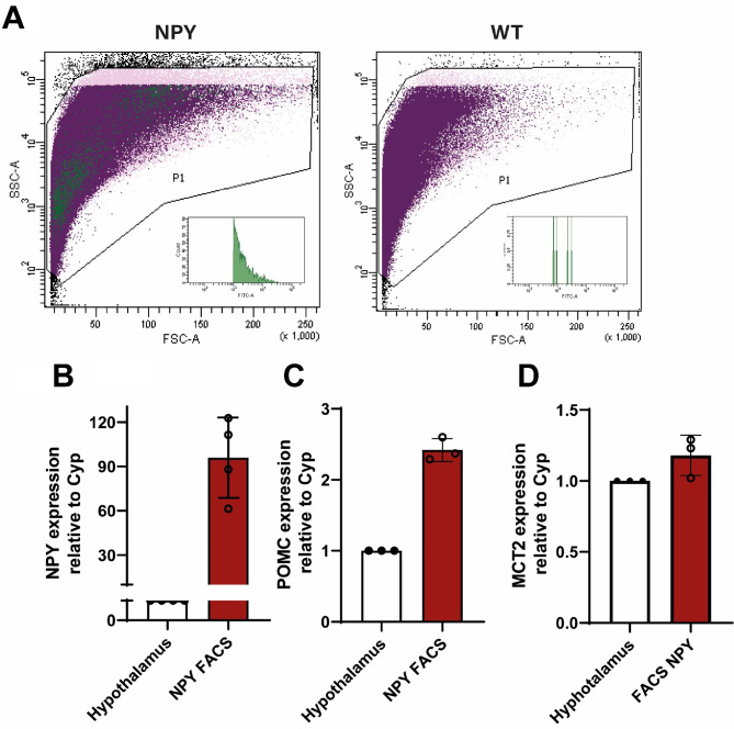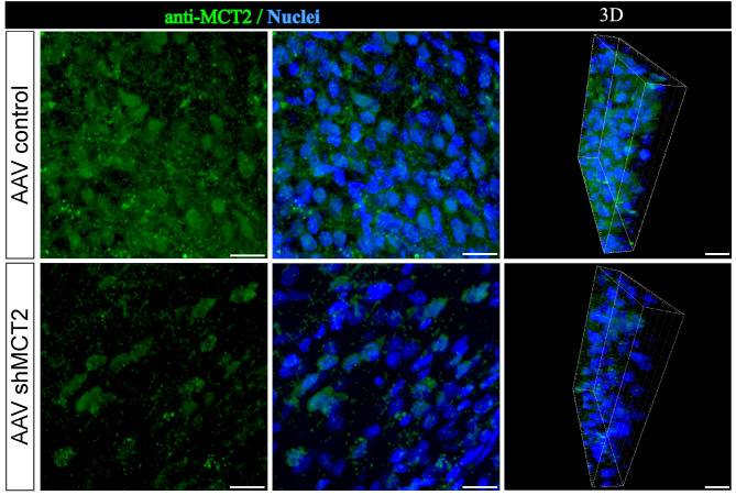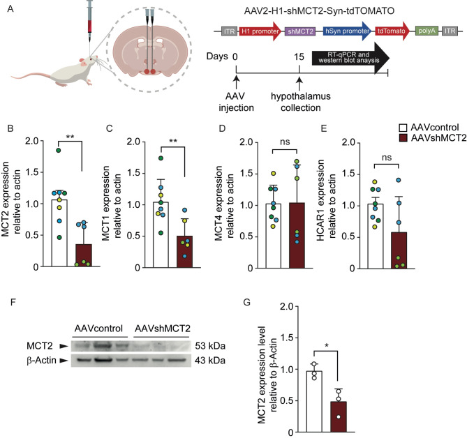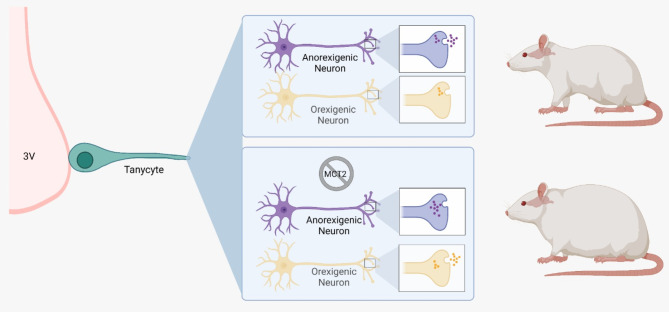 In the arcuate nucleus of the hypothalamus, tanycyte-neuron interactions regulate glucose homeostasis and feeding behavior. Previously, we reported that monocarboxylate transporters (MCT) 1 and 4 are localized in tanycytes, whereas MCT2 is present in arcuate nucleus neurons, including orexigenic and anorexigenic neurons (POMC). MCT1 and MCT4 inhibition impacts feeding behavior, suggesting that monocarboxylate transfer between tanycytes and neurons influences food intake. Electrophysiological studies have shown that POMC neurons respond to lactate through transport and indirect signaling using astrocytic hydroxycarboxylic acid receptor 1. To investigate the role of MCT2 further, we generated MCT2 knockdown rats and analyzed their feeding behavior. Female Sprague-Dawley rats received bilateral injections in the arcuate nucleus with an adeno-associated virus (AAV) carrying a specific short hairpin RNA to inhibit MCT2 expression, thereby generating neuronal MCT2 knockdown rats. Knockdown efficiency in rat hypothalamic tissue was assessed using real-time PCR, Western Blot, and immunohistochemistry. The acute effect on feeding behavior was evaluated following 24 h of fasting, followed by 24 h of refeeding. In MCT2-knockdown rats, we observed additional inhibition of MCT1, suggesting a potential glial response to increased parenchymal lactate levels. Both macrostructure and microstructure of feeding were evaluated in MCT2-knockdown rats and compared to control AAV-injected rats. MCT2 knockdown led to a significant increase in macrostructural parameters, such as food intake and body weight. These findings underscore the importance of lactate transfer as a mechanism in tanycyte-neuron communication mediated by monocarboxylates.