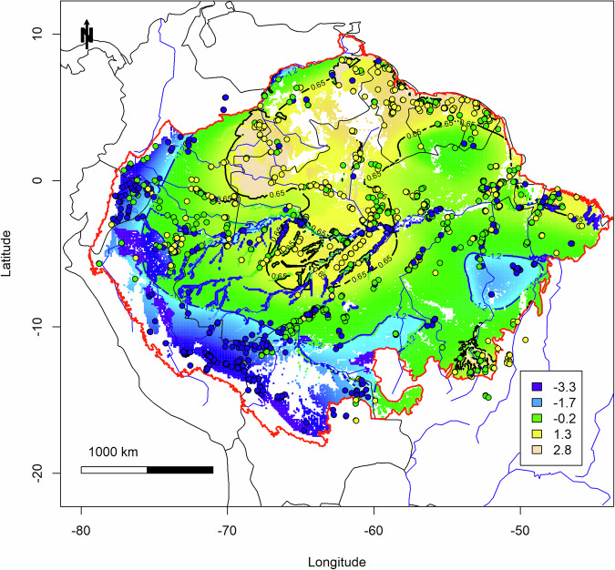 Plants cope with the environment by displaying large phenotypic variation. Two spectra of global plant form and function have been identified: a size spectrum from small to tall species with increasing stem tissue density, leaf size, and seed mass; a leaf economics spectrum reflecting slow to fast returns on investments in leaf nutrients and carbon. When species assemble to communities it is assumed that these spectra are filtered by the environment to produce community level functional composition. It is unknown what are the main drivers for community functional composition in a large area such as Amazonia. We use 13 functional traits, including wood density, seed mass, leaf characteristics, breeding system, nectar production, fruit type, and root characteristics of 812 tree genera (5211 species), and find that they describe two main axes found at the global scale. At community level, the first axis captures not only the 'fast-slow spectrum', but also most size-related traits. Climate and disturbance explain a minor part of this variance compared to soil fertility. Forests on poor soils differ largely in terms of trait values from those on rich soils. Trait composition and soil fertility exert a strong influence on forest functioning: biomass and relative biomass production.