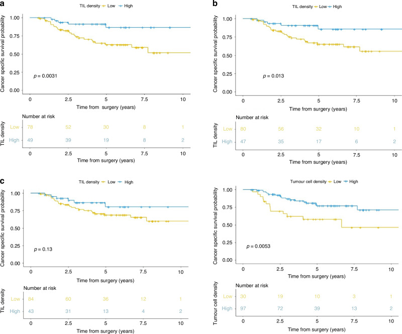 Results: Median TIL density was higher at the invasive margin than the luminal surface (963 vs 795 TILs/mm2, P = 0.010). TILs and TCD were independently prognostic in multivariate analyses (HR 4.28, 95% CI 1.87-11.71, P = 0.004; HR 2.72, 95% CI 1.19-6.17, P = 0.017, respectively). Patients with both low TCD and low TILs had the poorest survival (HR 10.0, 95% CI 2.51-39.78, P = 0.001), when compared to those with a high TCD and TILs score.
