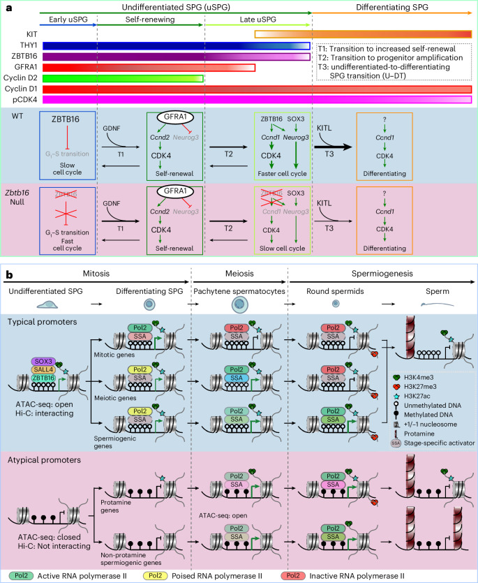 Spermatogonial stem cells balance self-renewal with differentiation and spermatogenesis to ensure continuous sperm production. Here, we identify roles for the transcription factor zinc finger and BTB domain-containing protein 16 (ZBTB16; also known as promyelocytic leukemia zinc finger (PLZF)) in juvenile mouse undifferentiated spermatogonia (uSPG) in promoting self-renewal and cell-cycle progression to maintain uSPG and transit-amplifying states. Notably, ZBTB16, Spalt-like transcription factor 4 (SALL4) and SRY-box transcription factor 3 (SOX3) colocalize at over 12,000 promoters regulating uSPG and meiosis. These regions largely share broad histone 3 methylation and acetylation (H3K4me3 and H3K27ac), DNA hypomethylation, RNA polymerase II (RNAPol2) and often CCCTC-binding factor (CTCF). Hi-C analyses show robust three-dimensional physical interactions among these cobound promoters, suggesting the existence of a transcription factor and higher-order active chromatin interaction network within uSPG that poises meiotic promoters for subsequent activation. Conversely, these factors do not notably occupy germline-specific promoters driving spermiogenesis, which instead lack promoter-promoter physical interactions and bear DNA hypermethylation, even when active. Overall, ZBTB16 promotes uSPG cell-cycle progression and colocalizes with SALL4, SOX3, CTCF and RNAPol2 to help establish an extensive and interactive chromatin poising network.