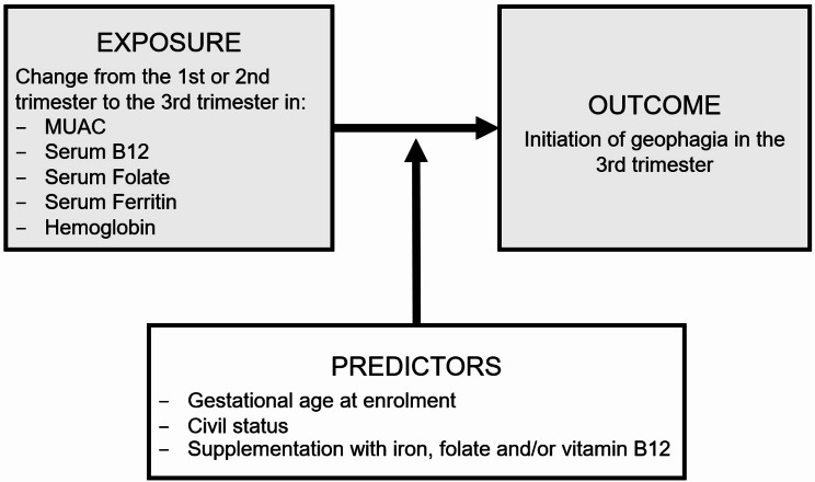 Methods: Pregnant women (n = 530) were interviewed in each trimester regarding their soil-eating habits. Serum concentrations of vitamin B12, folate, ferritin, and hemoglobin, and MUAC were measured before conception and in each trimester. Cross-sectional comparisons between women who ate and did not eat soil were analyzed using Welch's t-test for continuous variables and χ2-test for categorical variables. The association between changes in nutritional status parameters and the initiation of geophagia was investigated using multivariable logistic regression.