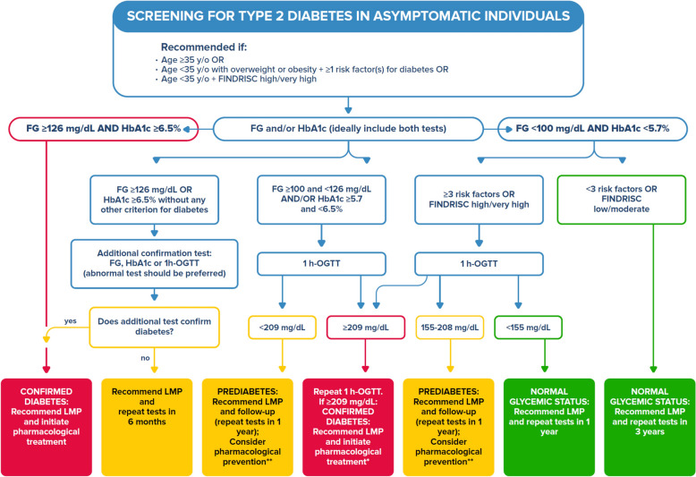 Results and conclusions: Fifteen specific recommendations were formulated. Screening is recommended for adults aged 35 and older or younger individuals with obesity and additional risk factors. For children and adolescents, screening is recommended starting at age ten or the onset of puberty if they are overweight or obese and have additional risk factors. Fasting plasma glucose (FPG) and HbA1c are recommended as initial screening tests. The oral glucose tolerance test (OGTT) is recommended for high-risk individuals with normal HbA1c and FPG or those with prediabetes. The 1-h OGTT is preferred over the 2-h OGTT, as it is both more practical and a superior test. A structured approach to reevaluation intervals is provided.
